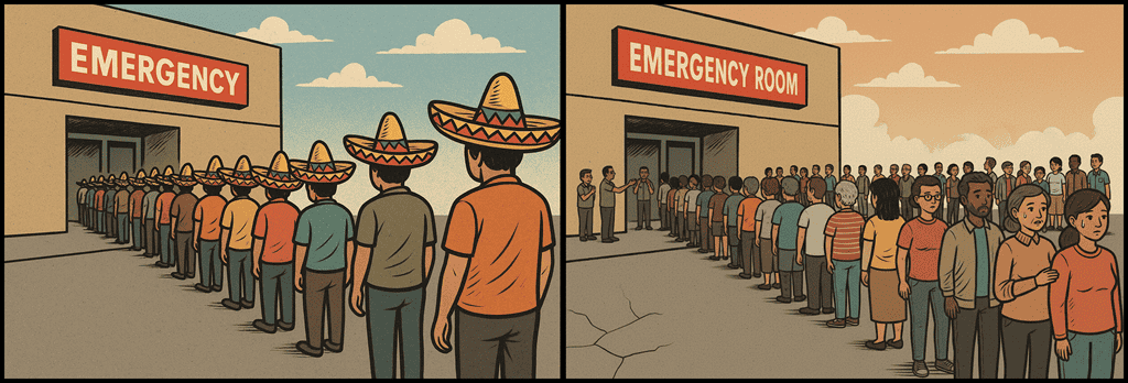 ERs overflow with patients who should never have been eligible for reimbursement under a system meant to serve citizens. Wait times in metro areas increase from 45 minutes to over 3 hours. Rural hospitals report wait times of 6–8 hours. Medical staff are exhausted, resources stretched, and communities watch hospitals crumble under ideological experiments.