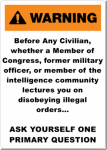 The Question No One in Washington Wants You to Ask. Before any civilian — including members of Congress, be they a former officer or intelligence operative — lectures you about “refusing illegal orders,” stop and ask yourself one brutally simple question: Will THEY suffer the consequences for your actions? Will