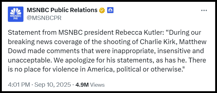 There is no evidence linking Kirk’s ideas to the act of violence committed against him. To suggest otherwise is a grotesque distortion of reality. Dowd turns tragedy into a lecture on “hateful thoughts,” “hateful words,” and “hateful actions,” all while the victim cannot defend himself. That is moral bankruptcy in its purest form.